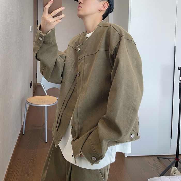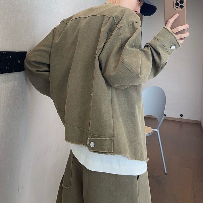 ミリタリーテイストを取り入れたノーカラージャケット。