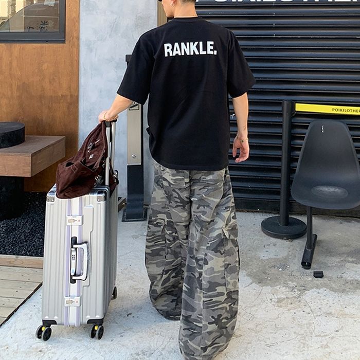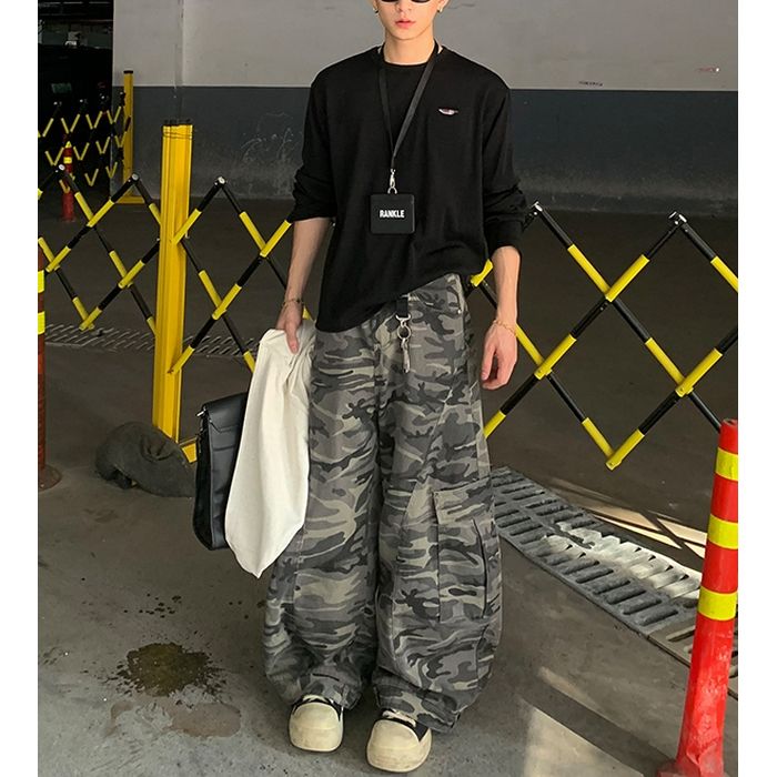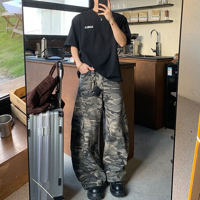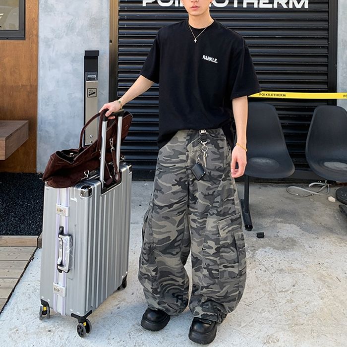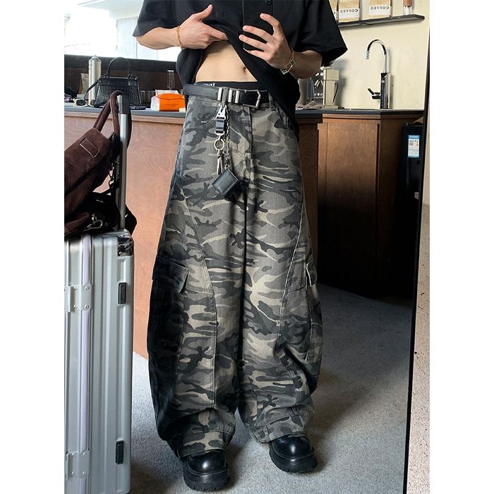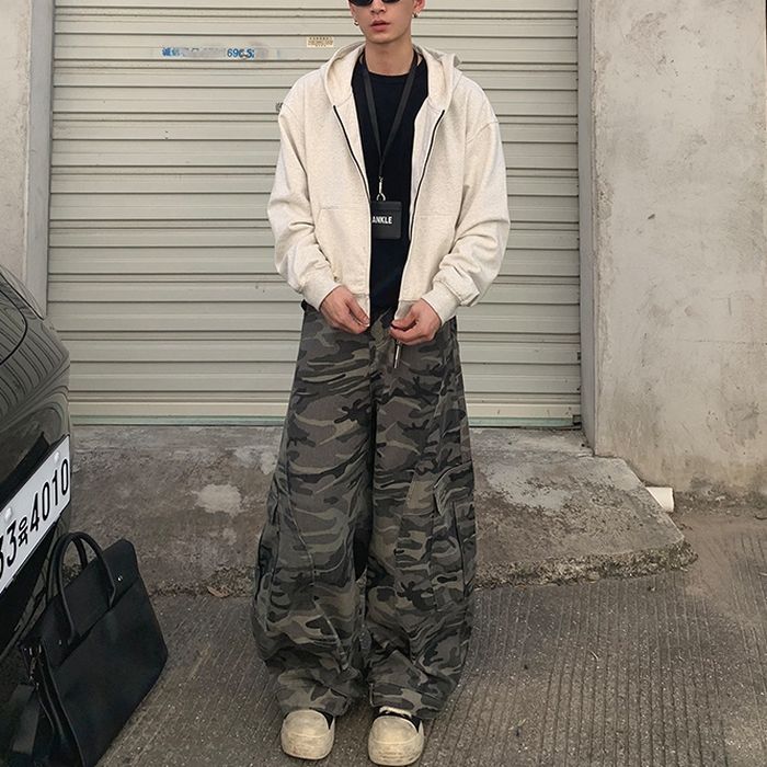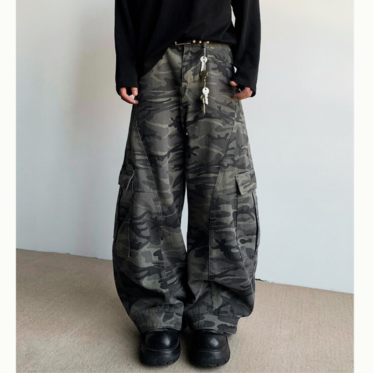 存在感抜群のワイドシルエットに、無骨なカモフラージュ柄を組み合わせたパンツ。