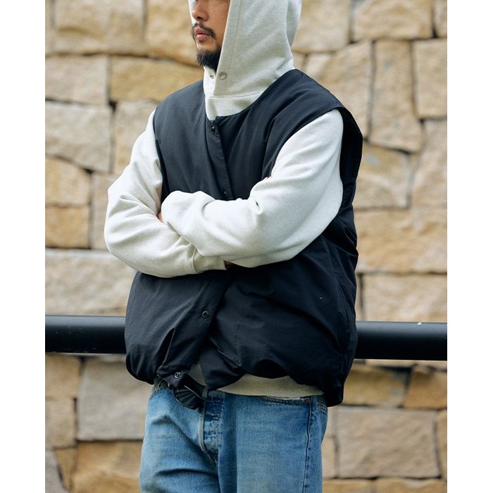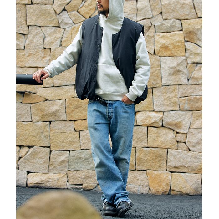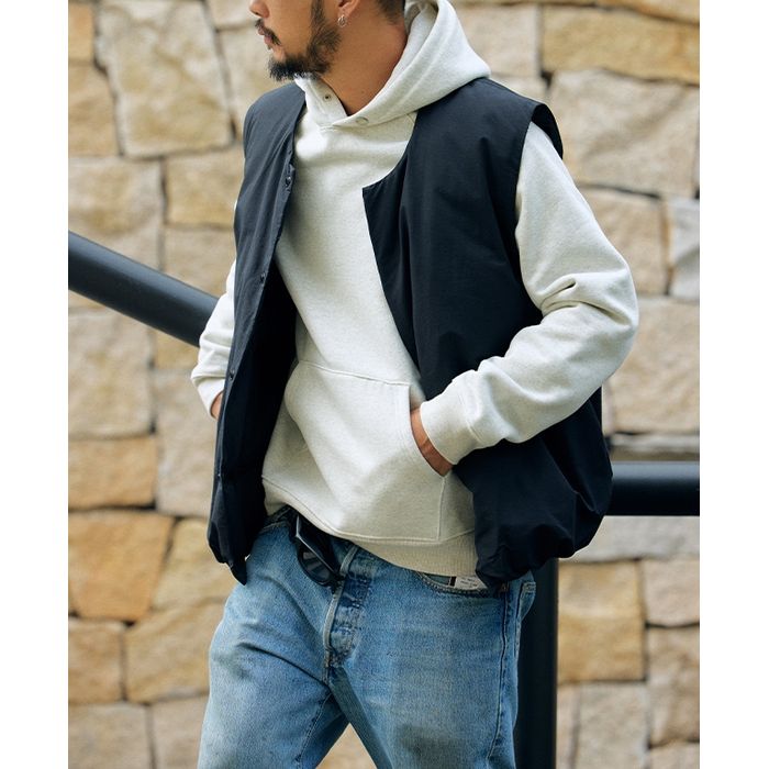 スウェットやフーディの上から羽織るだけで、都会的なアウトドアスタイルに仕上がります。