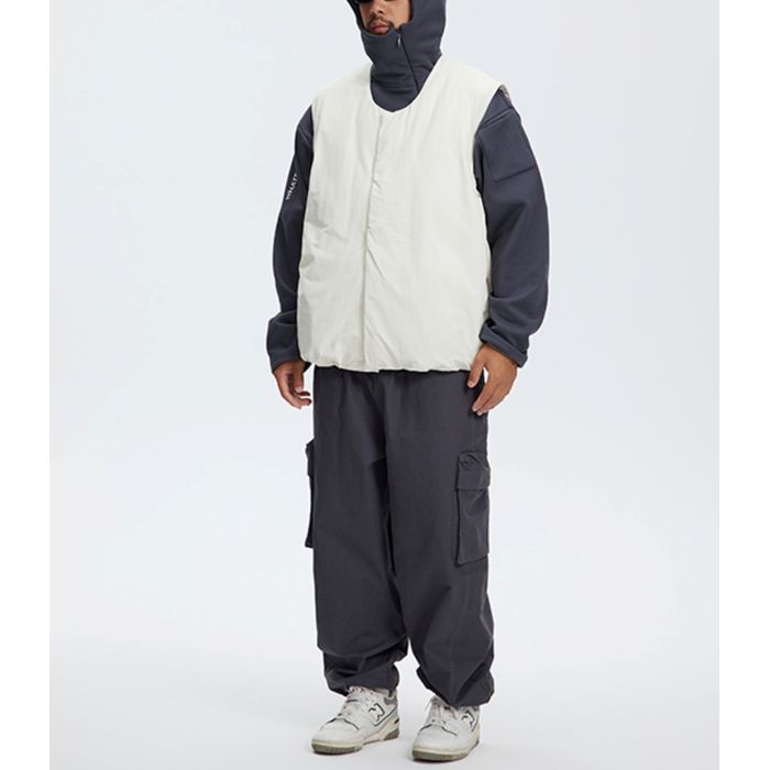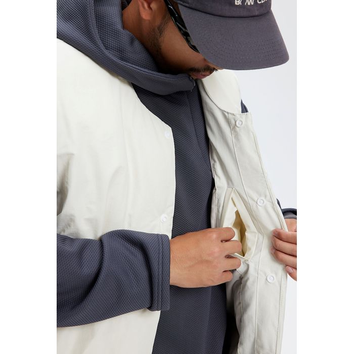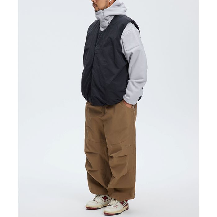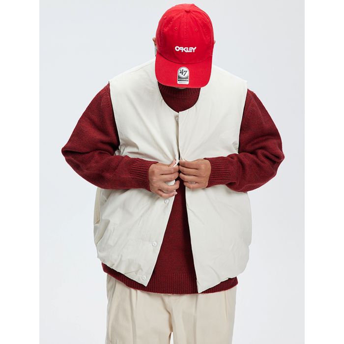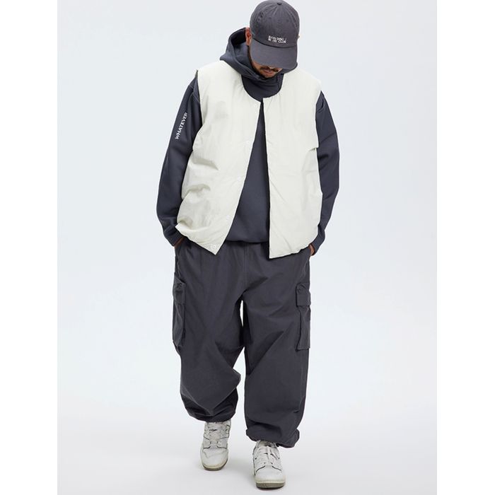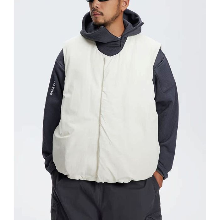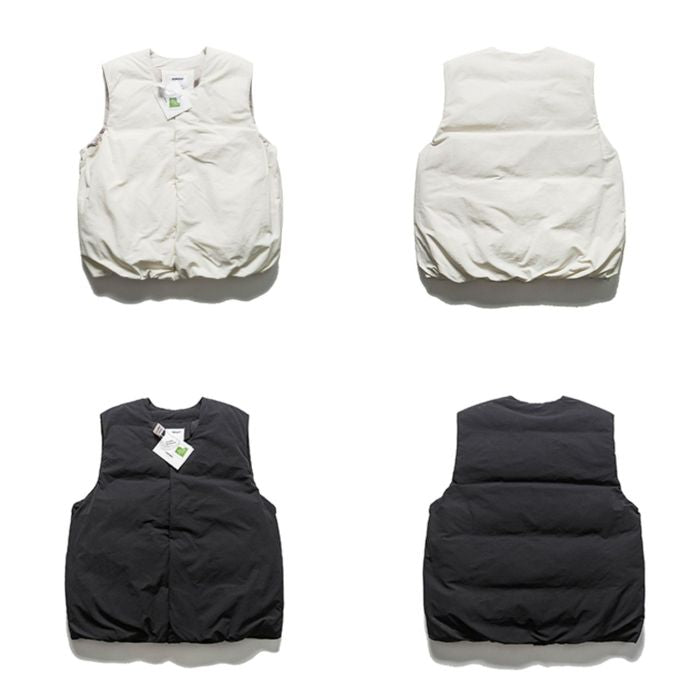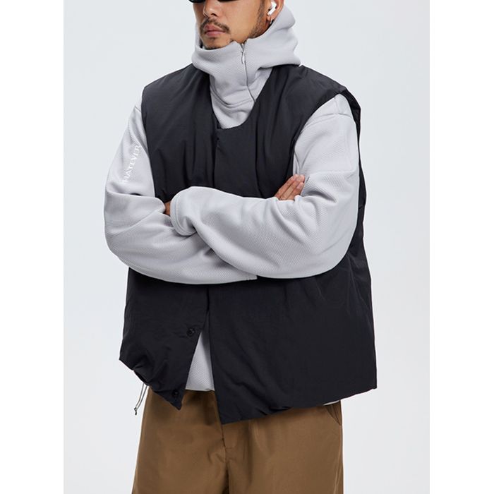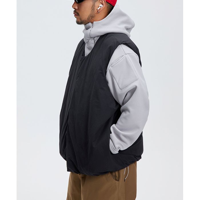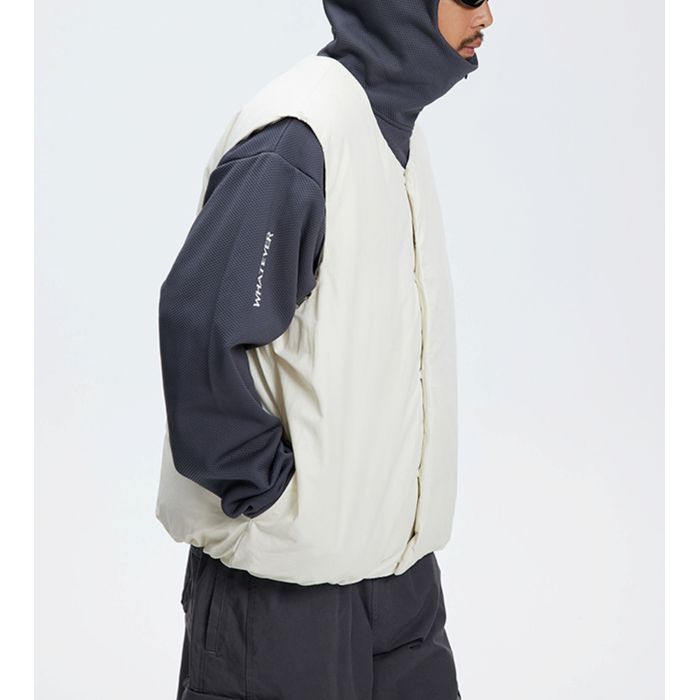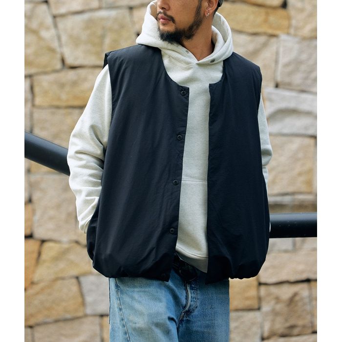 フロントをすっきりと見せる隠しボタン仕様の中綿ベスト。