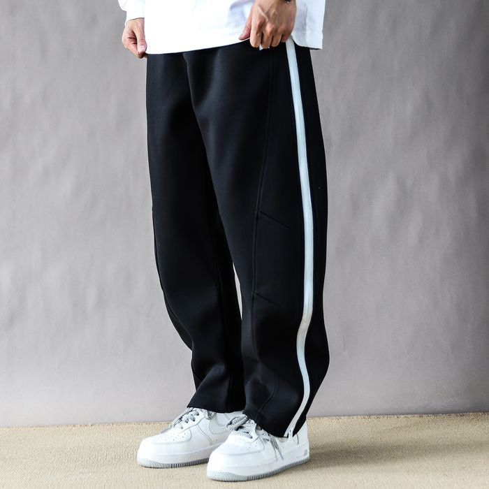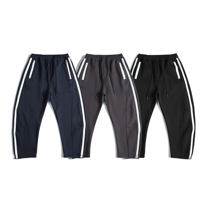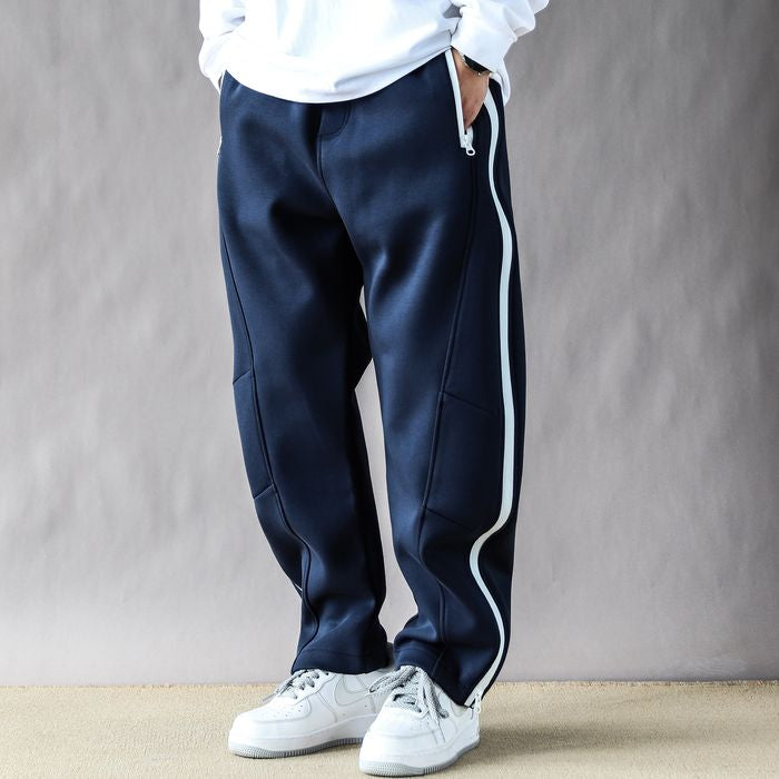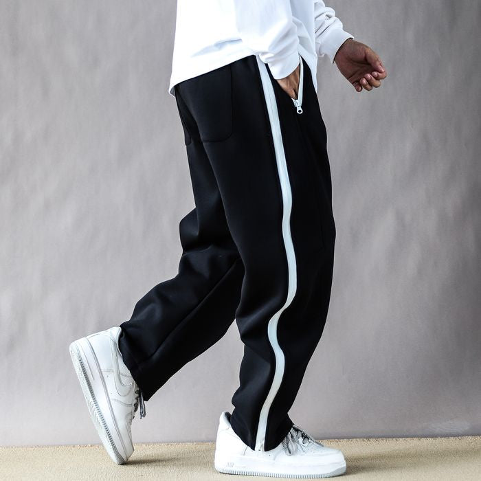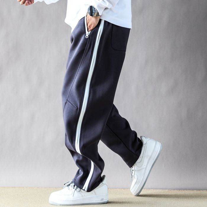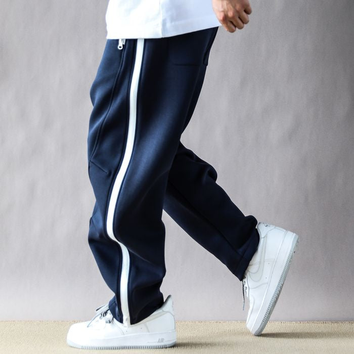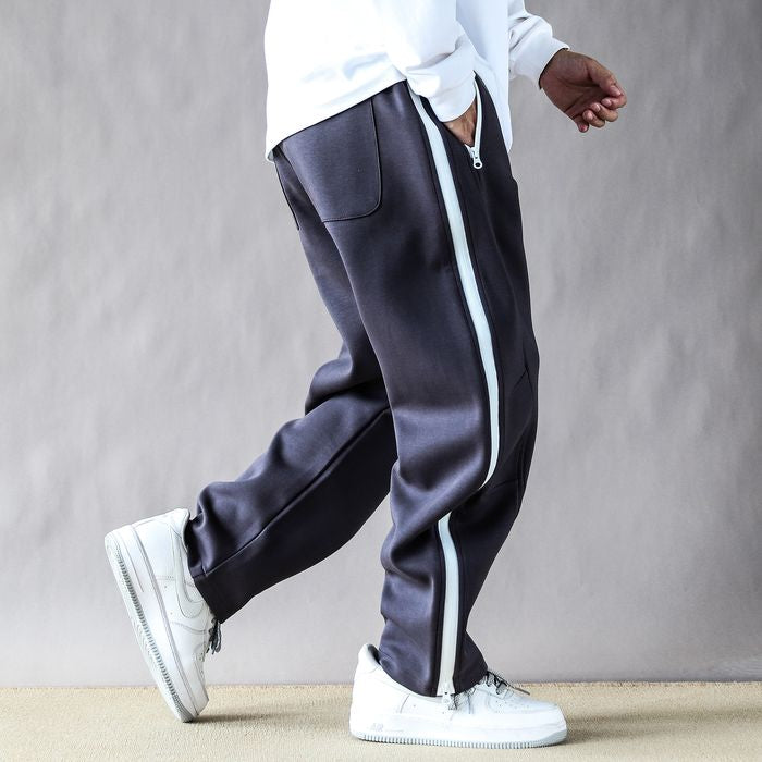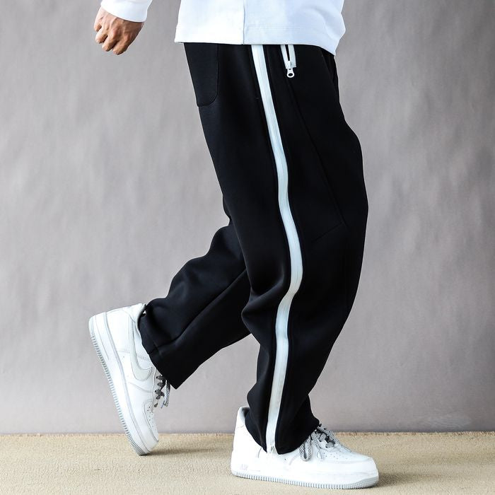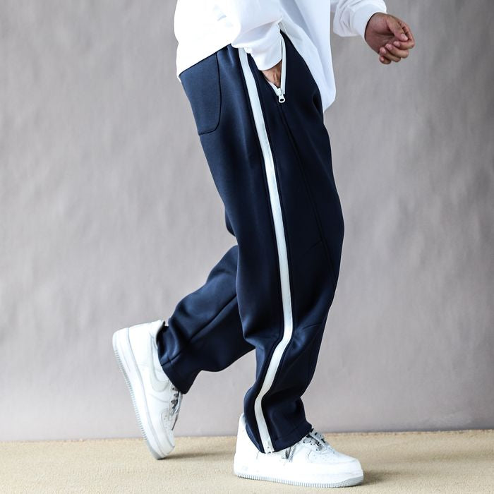 サイドのラインとジップデザインが特徴のパンツ。生地は厚手で、秋冬にぴったりです。