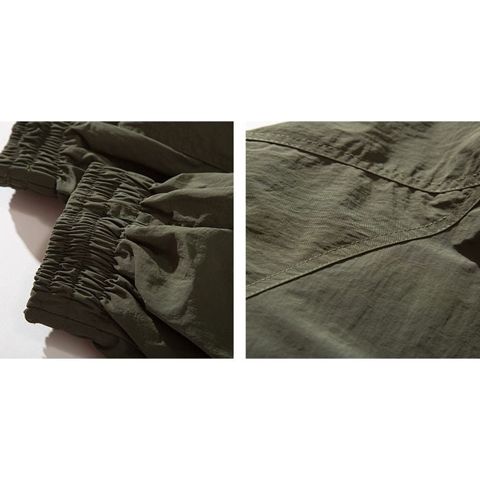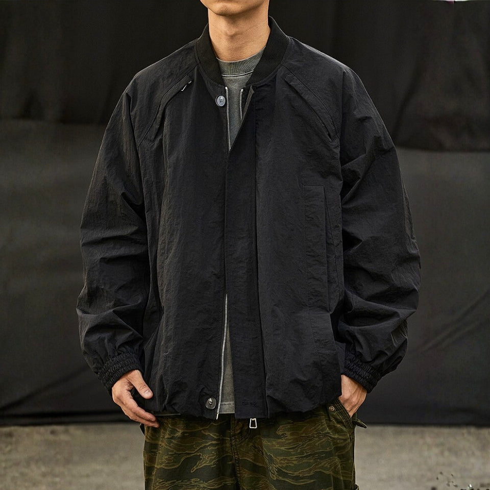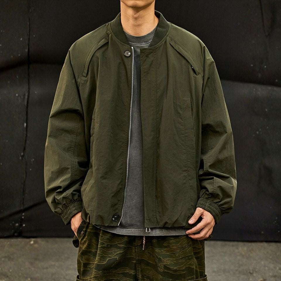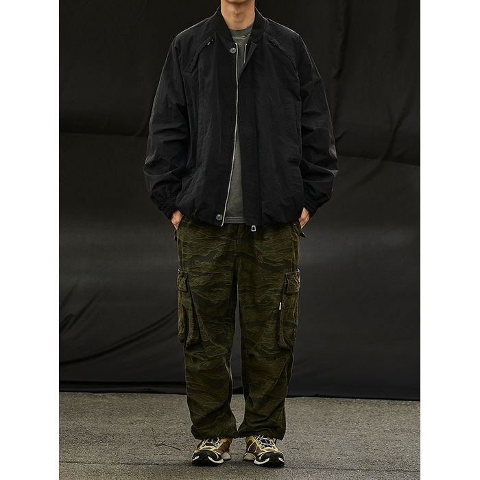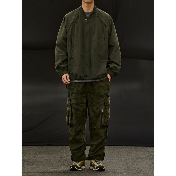カーキのカーゴパンツを合わせると無骨な雰囲気にまとまり、デニムと組み合わせれば程よく抜けた印象になります。