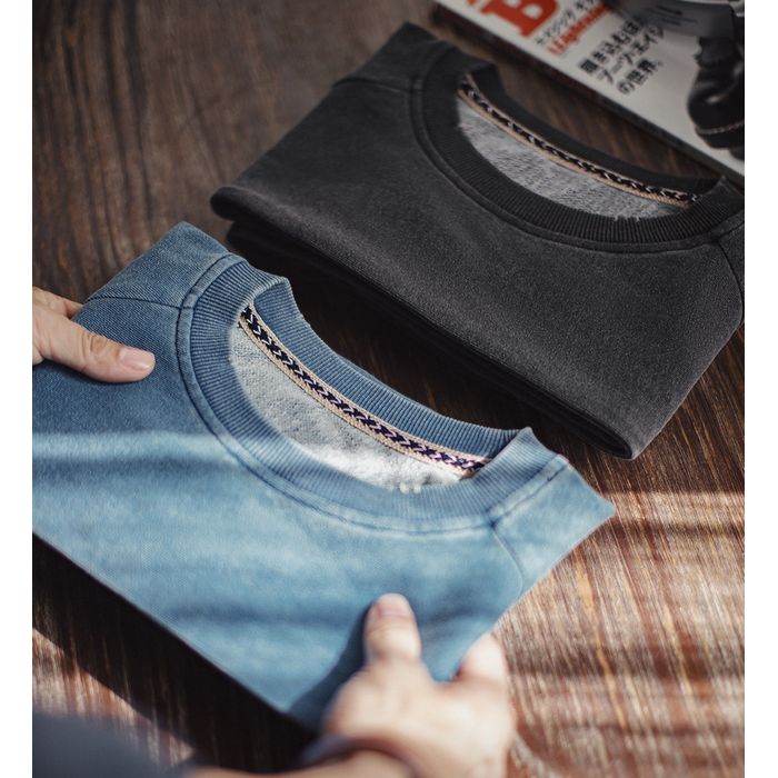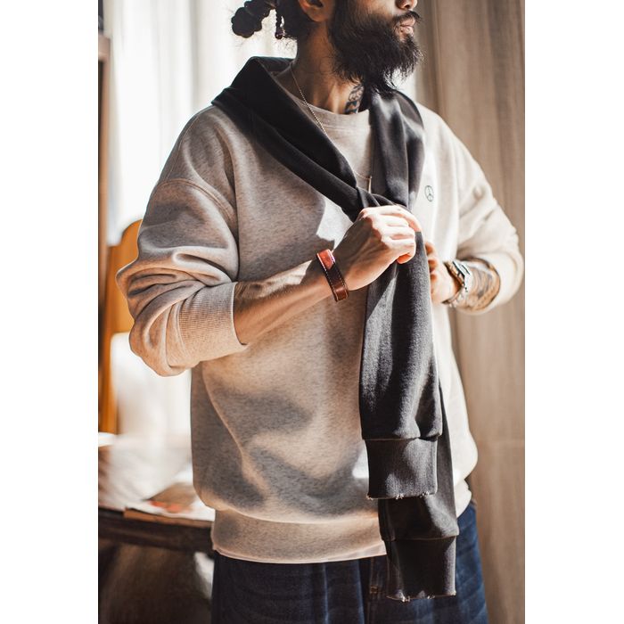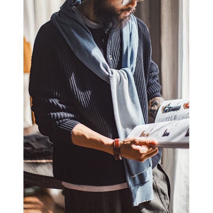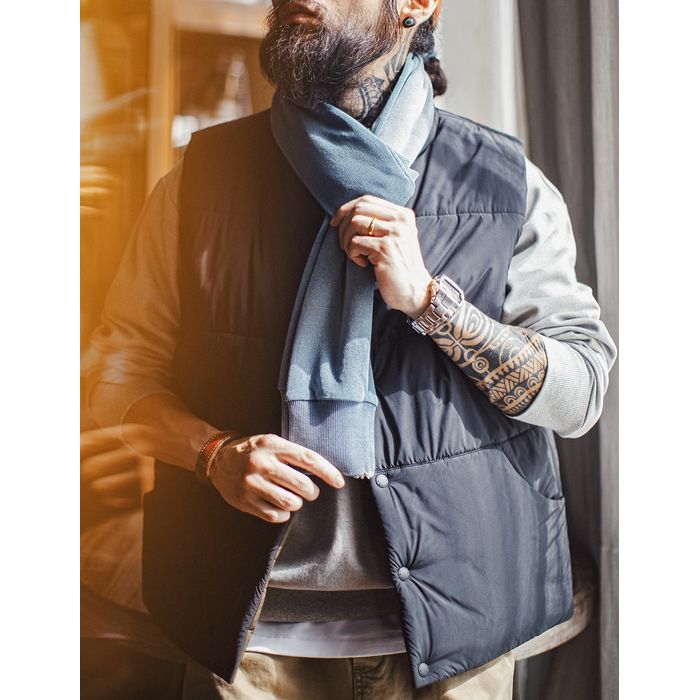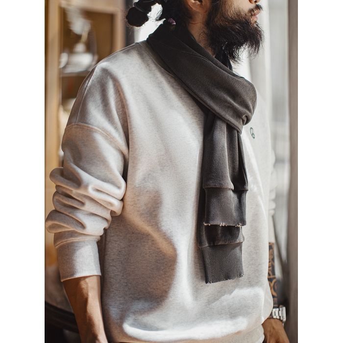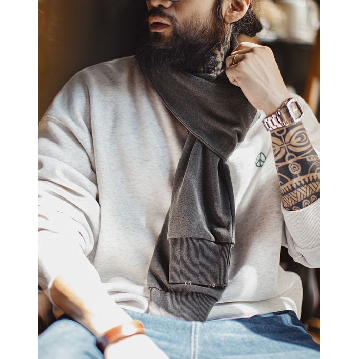 スウェットを肩に掛けたようなデザインが特徴のマフラー。