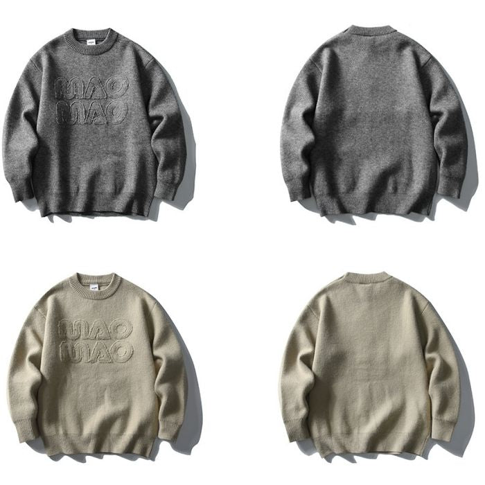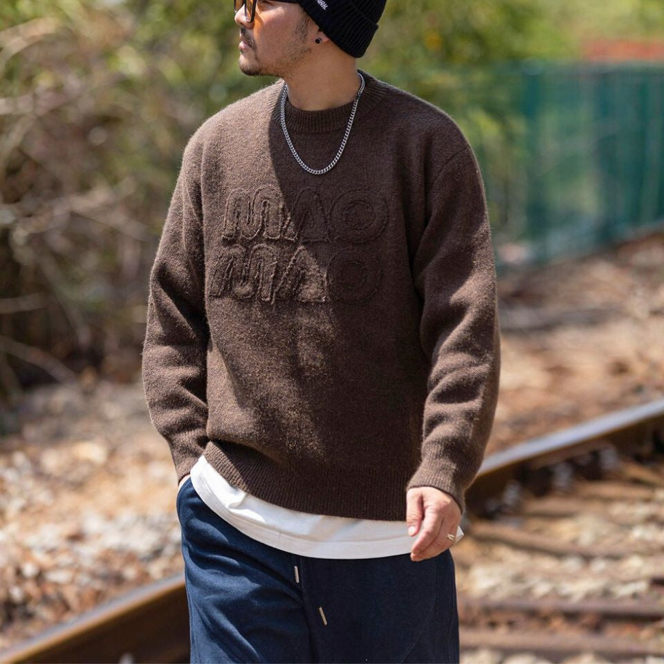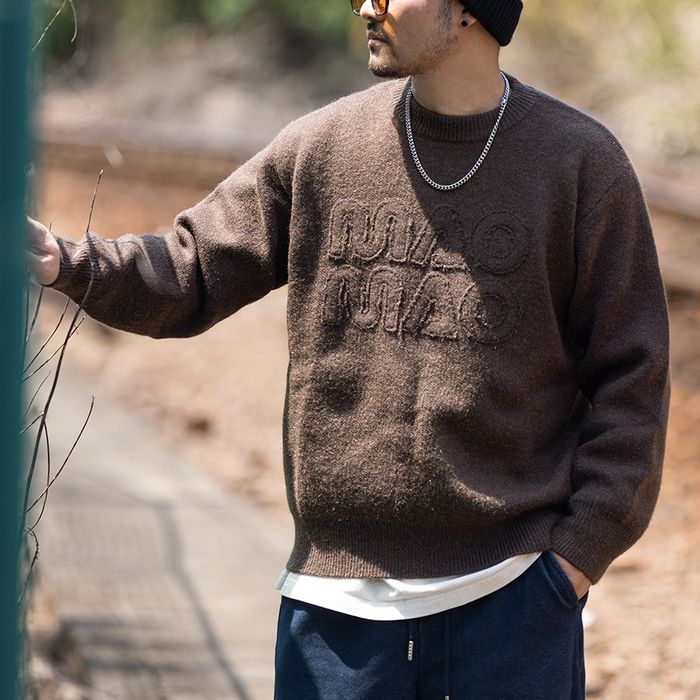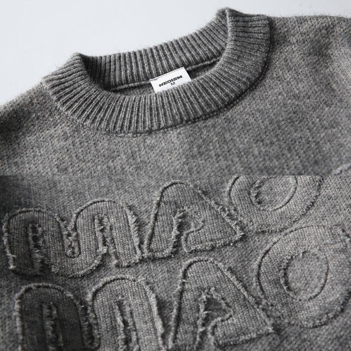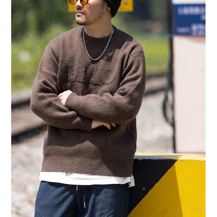 フロントに立体的なロゴデザインをあしらったクルーネックニット。
