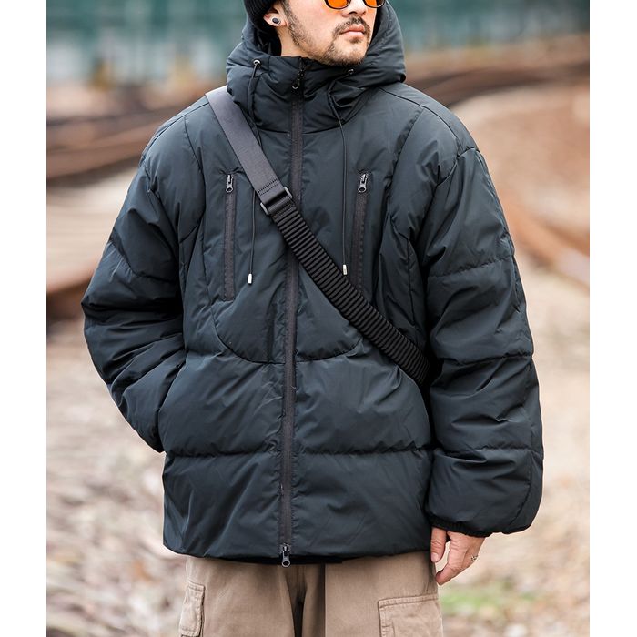 ボリューム感のあるシルエットが特徴のフード付きジャケット。
