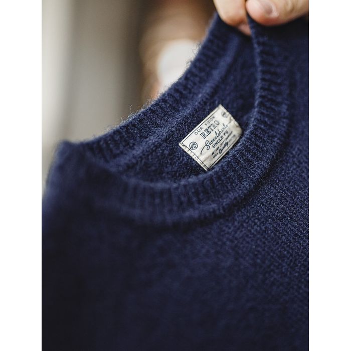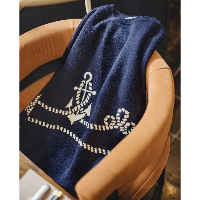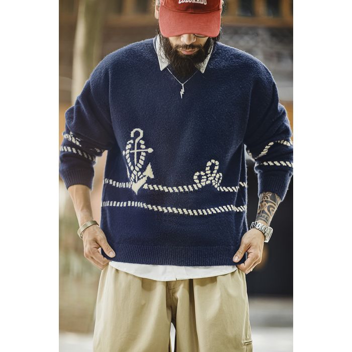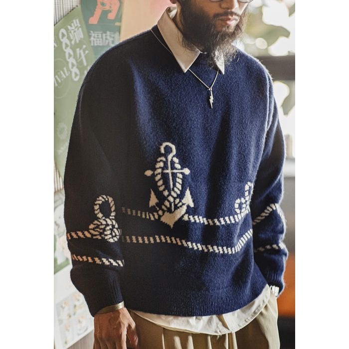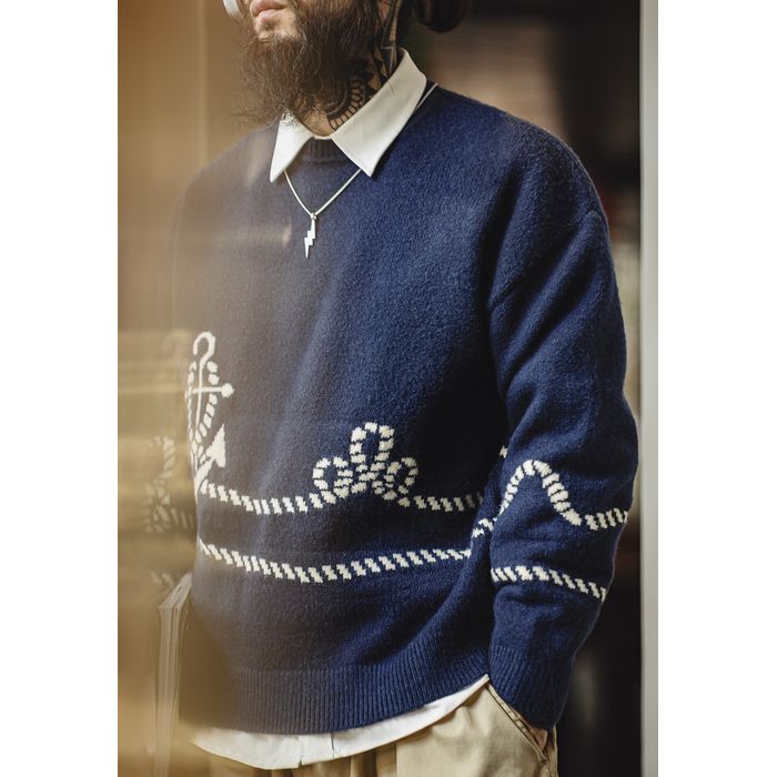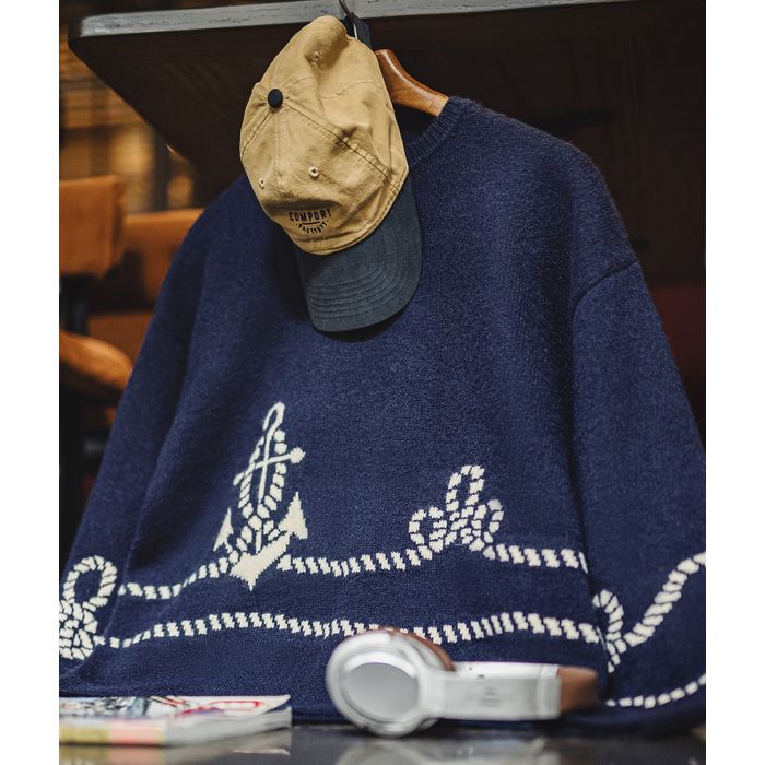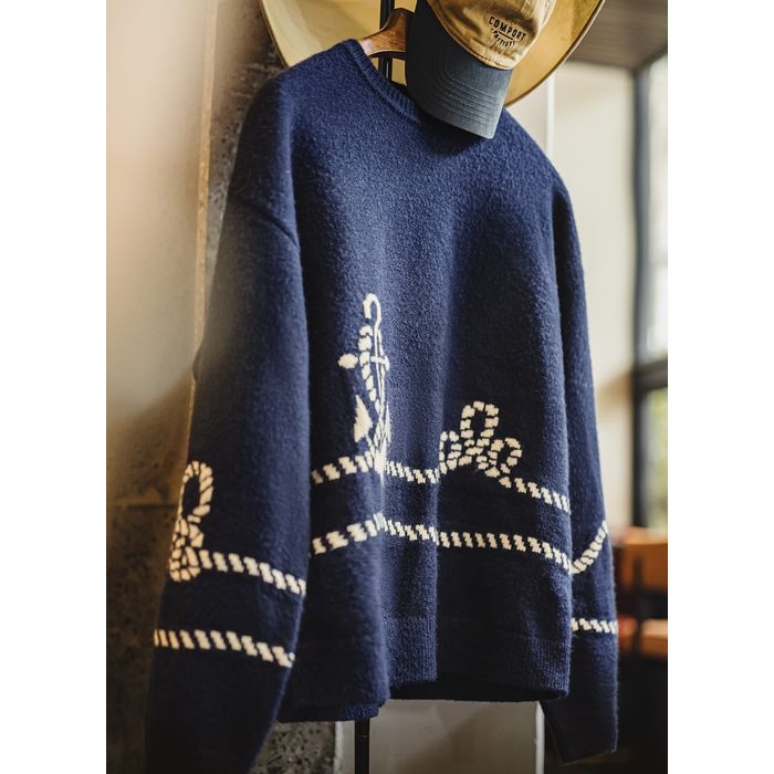 マリンモチーフのロープ柄が印象的なネイビーのニットプルオーバー。