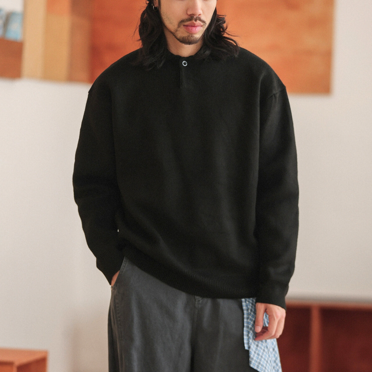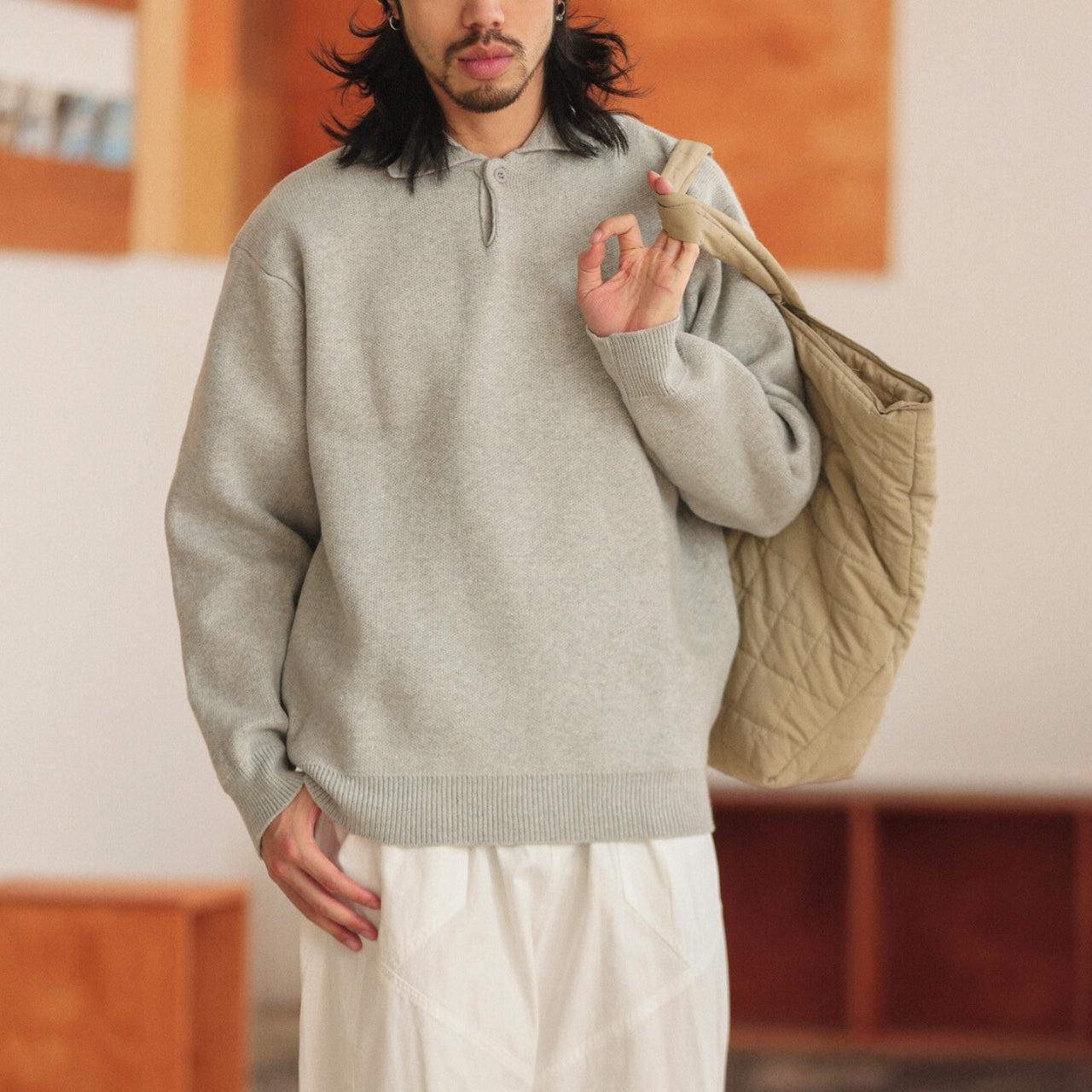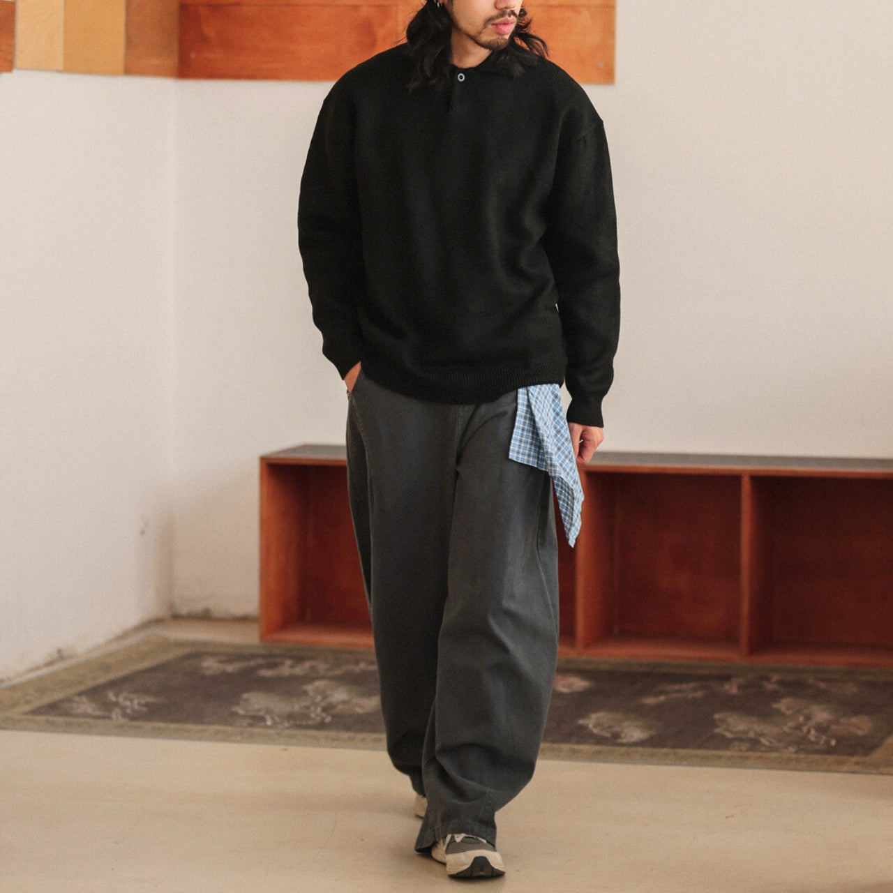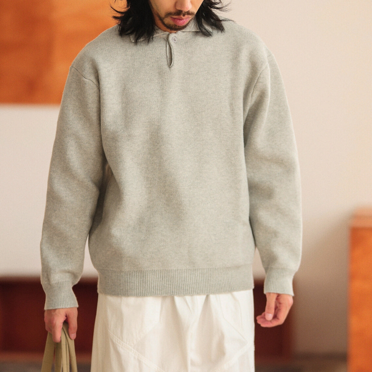 首元はボタンを省いたミニマルな仕上がりで、クリーンさと抜け感をほどよく両立。