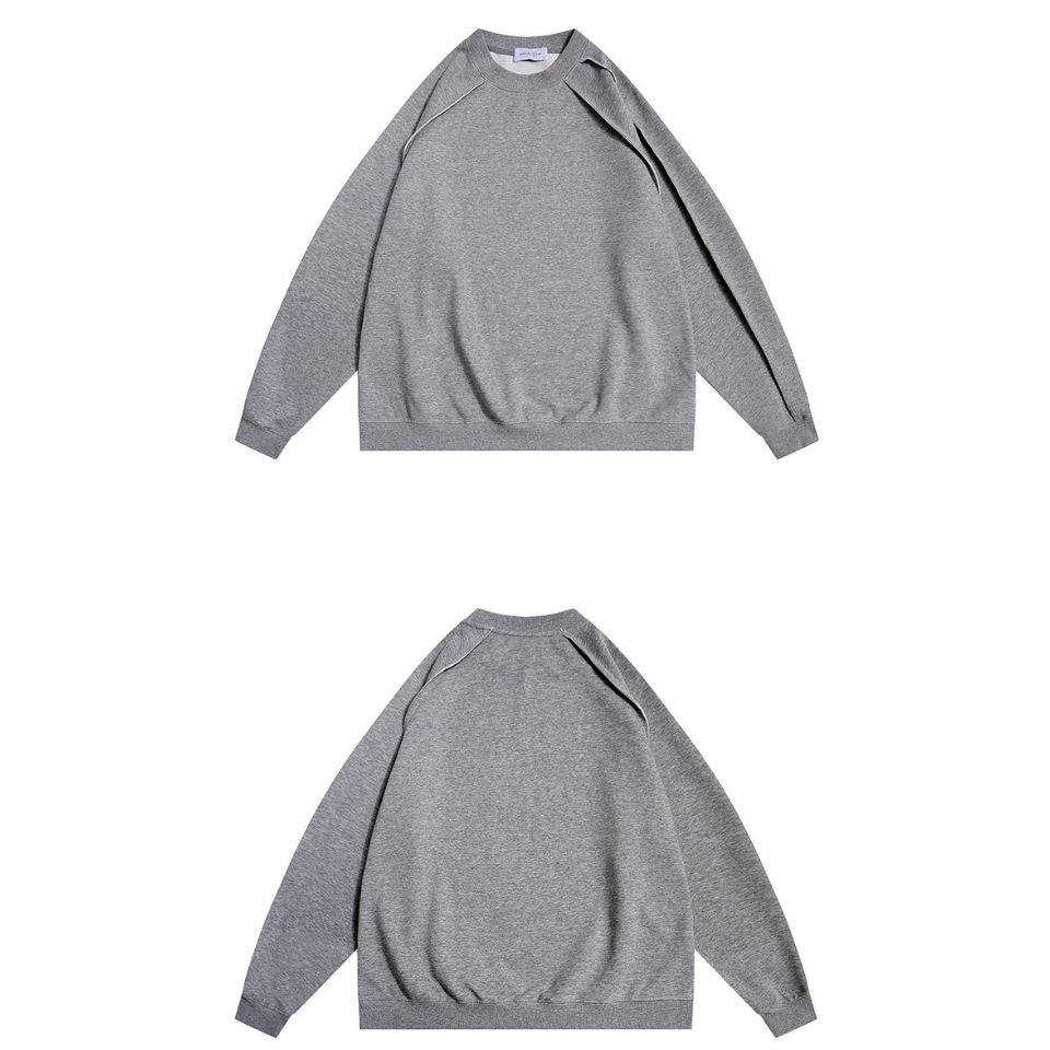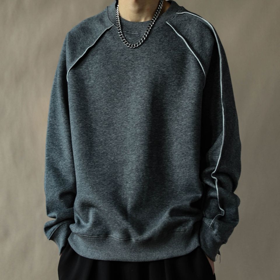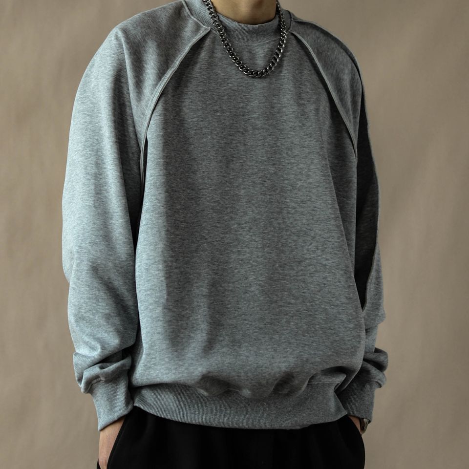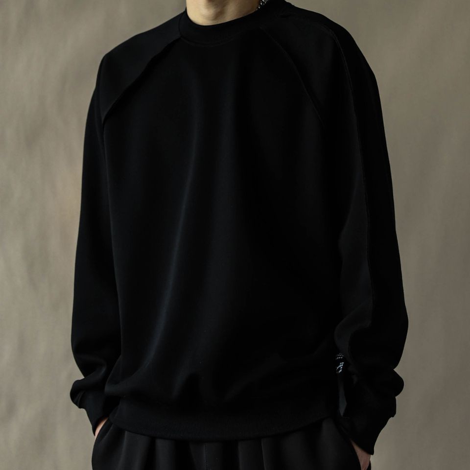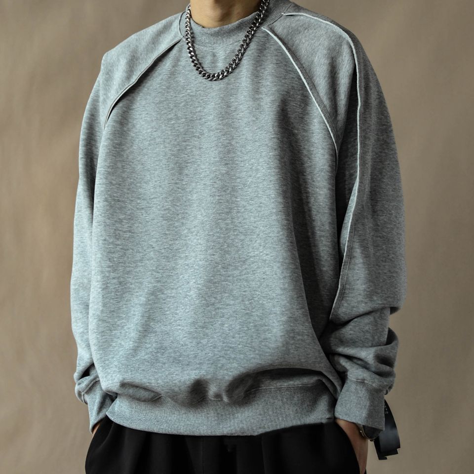 肩まわりの大胆な切替ラインが印象的なラグランスウェット。アシンメトリーに走るディテールがさりげない存在感を生み、ゆとりあるフォルムが自然な抜け感を演出します。動きに沿う設計で、日常からストリートまで映える一枚です。