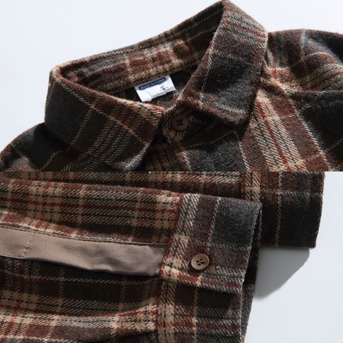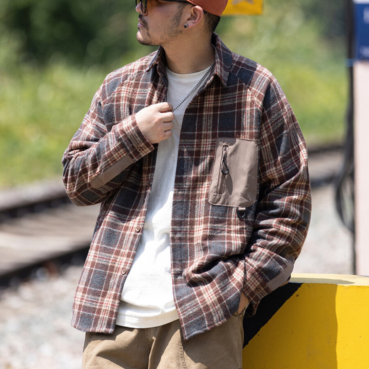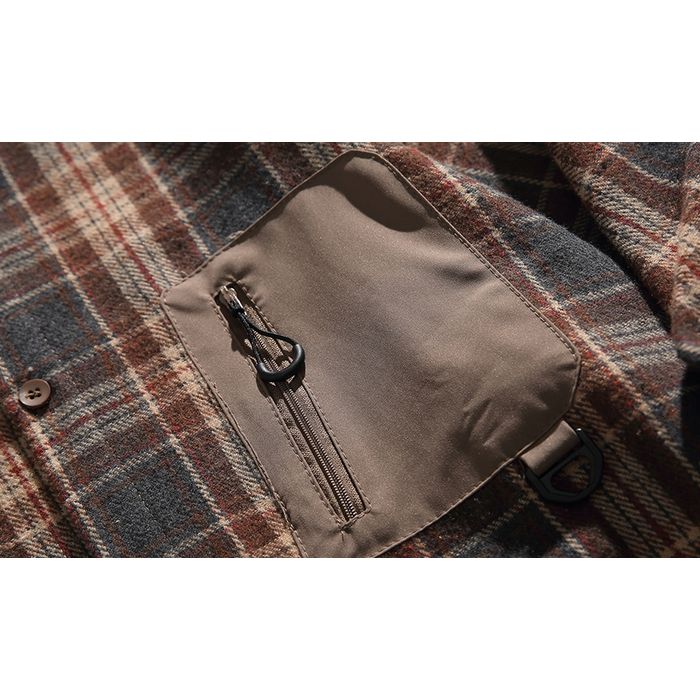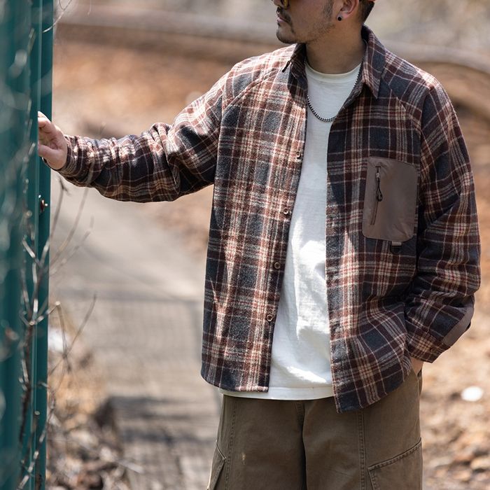 異素材ポケットがアクセントになったチェック柄シャツ。