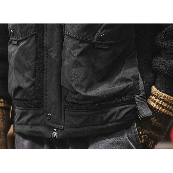 厚みのあるボアにナイロン調の切り替えを組み合わせ、保温性とデザイン性を両立。