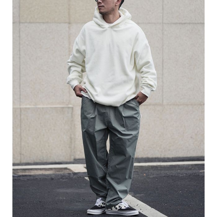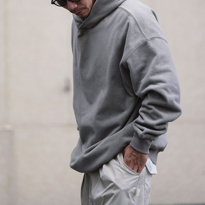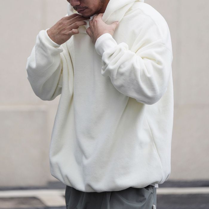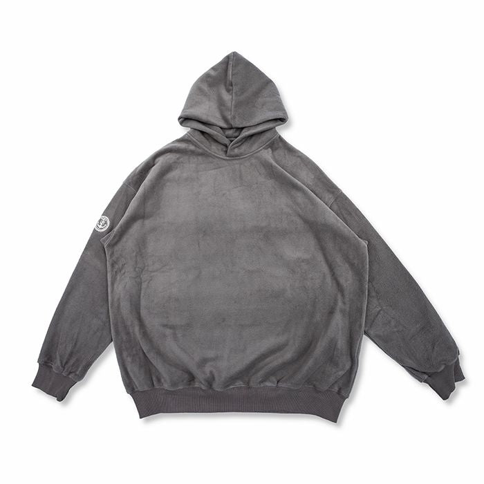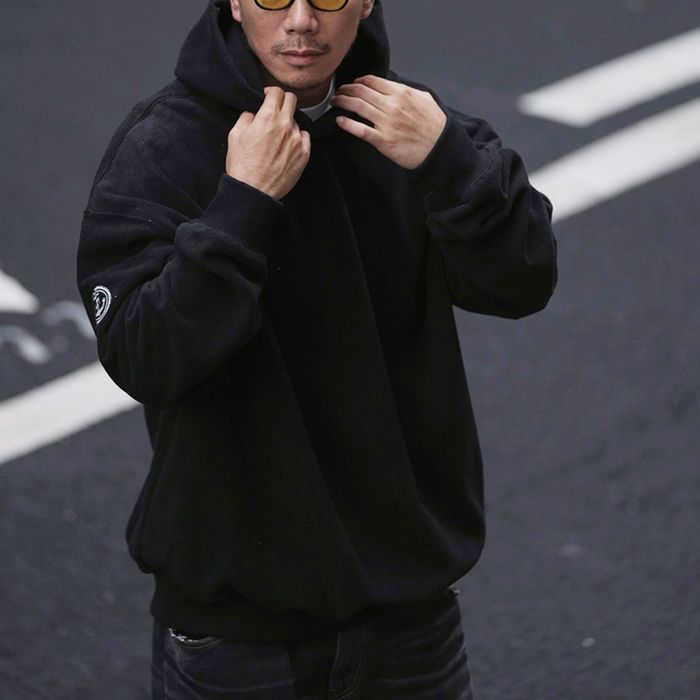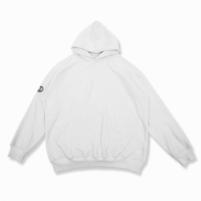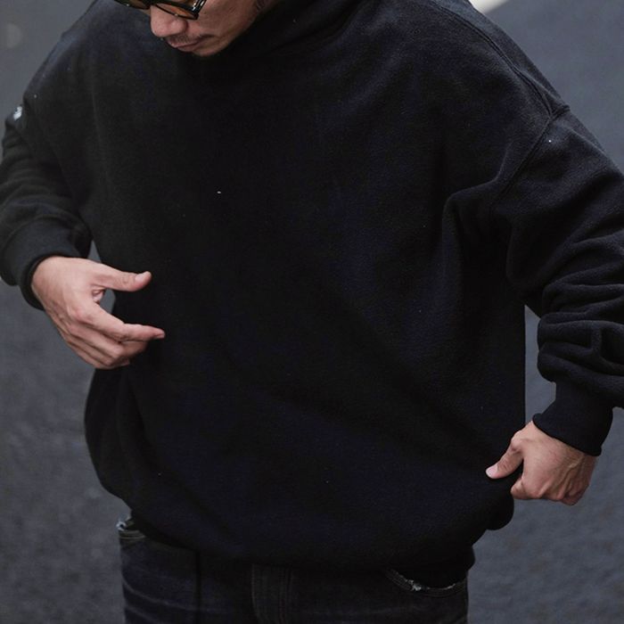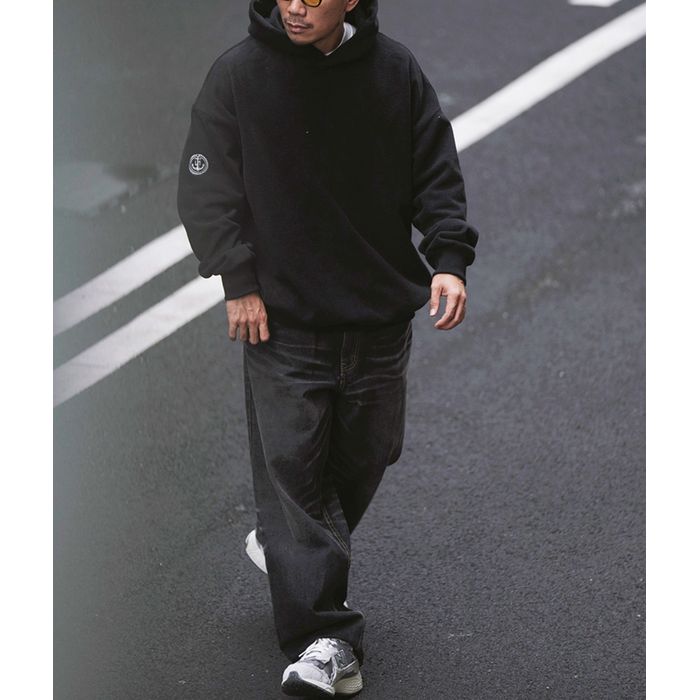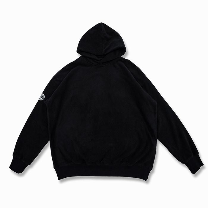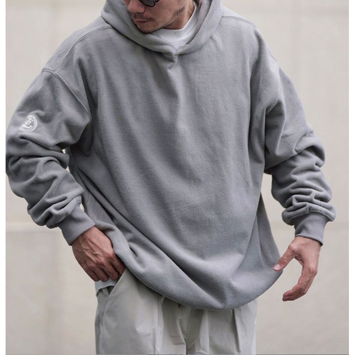 左腕のワンポイント刺繍が映える、保温性抜群のプルオーバー フーディ。
